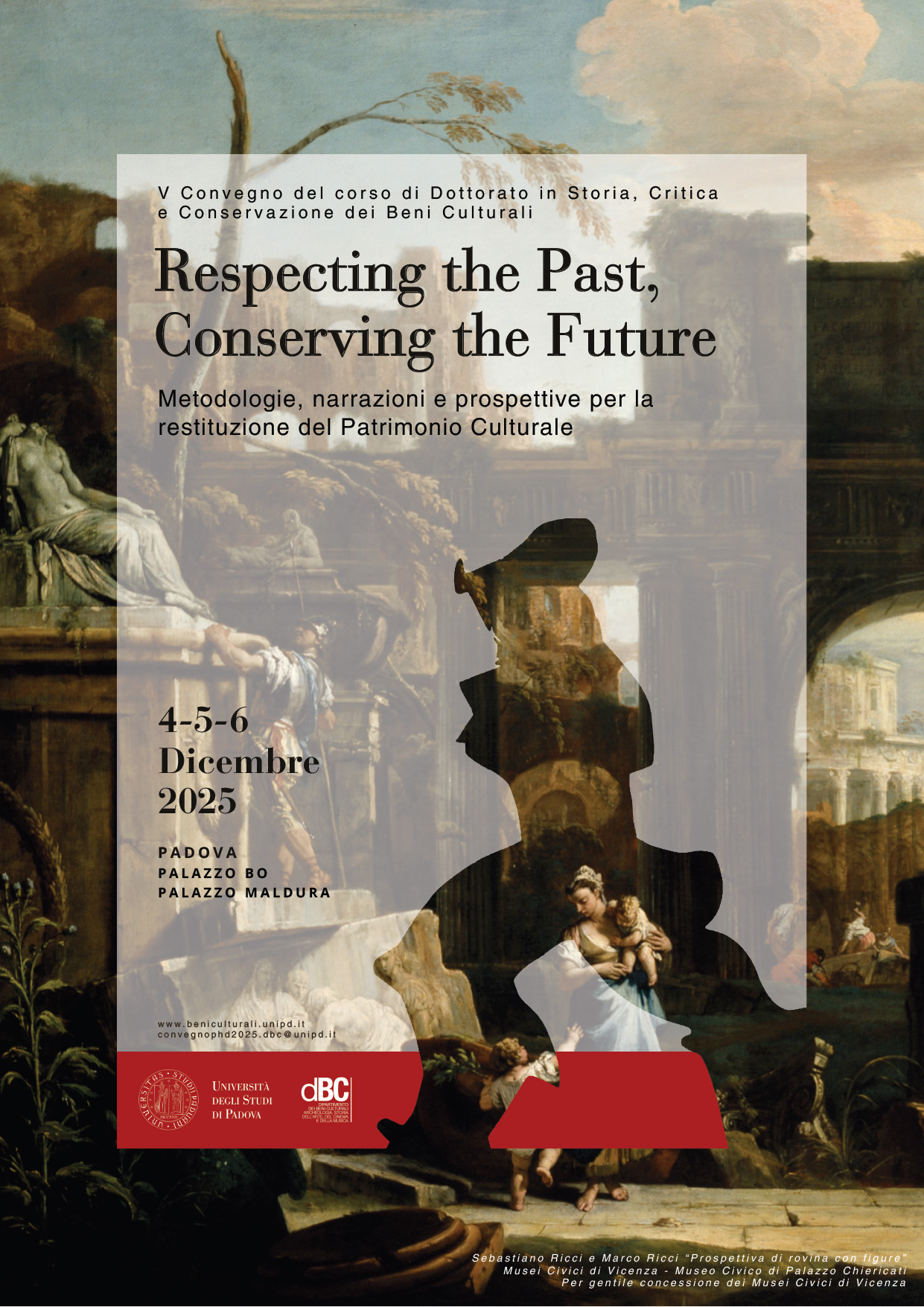 The PhD Course in History, Criticism and Conservation of Cultural Heritage of the University of Padua presents the international conference "Respecting the Past, Conserving the Future. Methodologies, narratives and perspectives for the restitution of cultural heritage", organised by the PhD students of the XXXIX cycle. The conference will be held in Padua on 4, 5 and 6 December 2025 at Palazzo Bo and Palazzo Maldura.