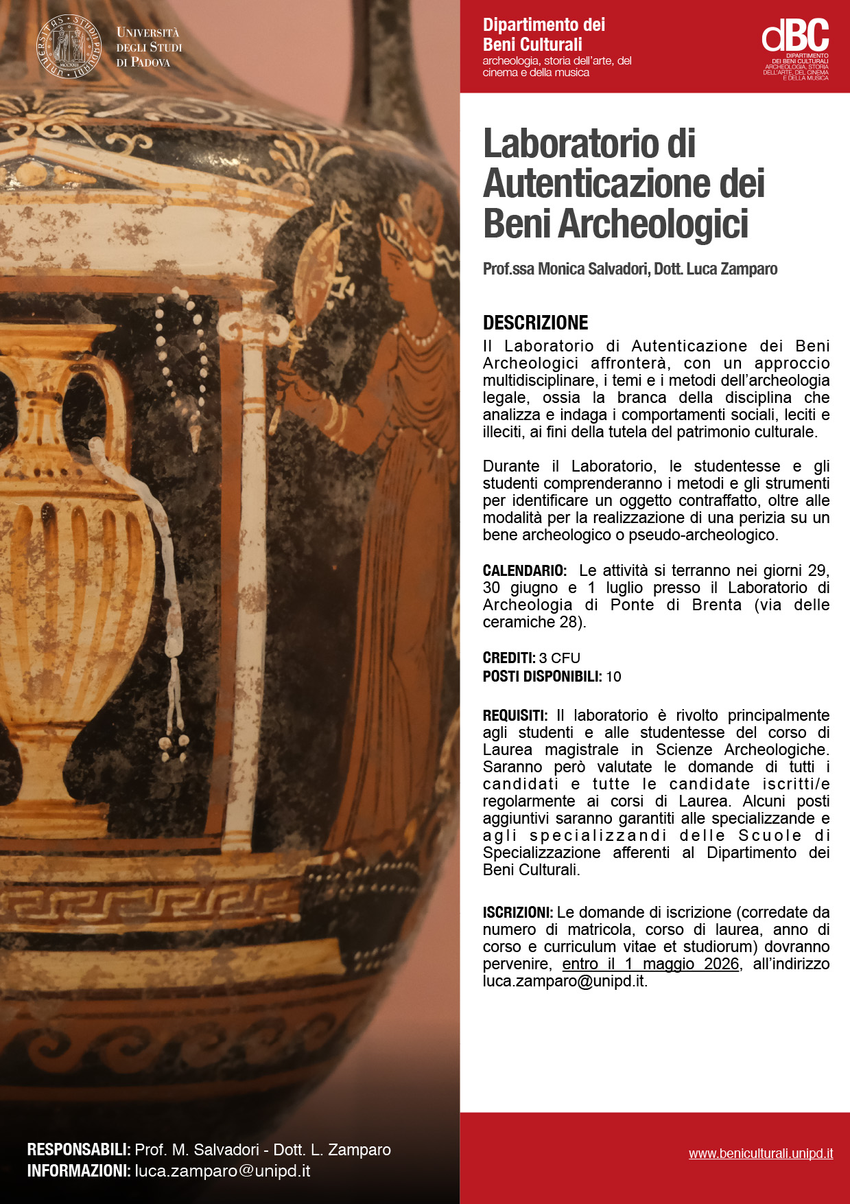 REQUISITI: Il laboratorio è rivolto principalmente agli studenti e alle studentesse del corso di Laurea magistrale in Scienze Archeologiche. Saranno però valutate le domande di tutti i candidati e tutte le candidate iscritti/e regolarmente ai corsi di Laurea. Alcuni posti aggiuntivi saranno garantiti alle specializzande e agli specializzandi delle Scuole di Specializzazione afferenti al Dipartimento dei Beni Culturali.