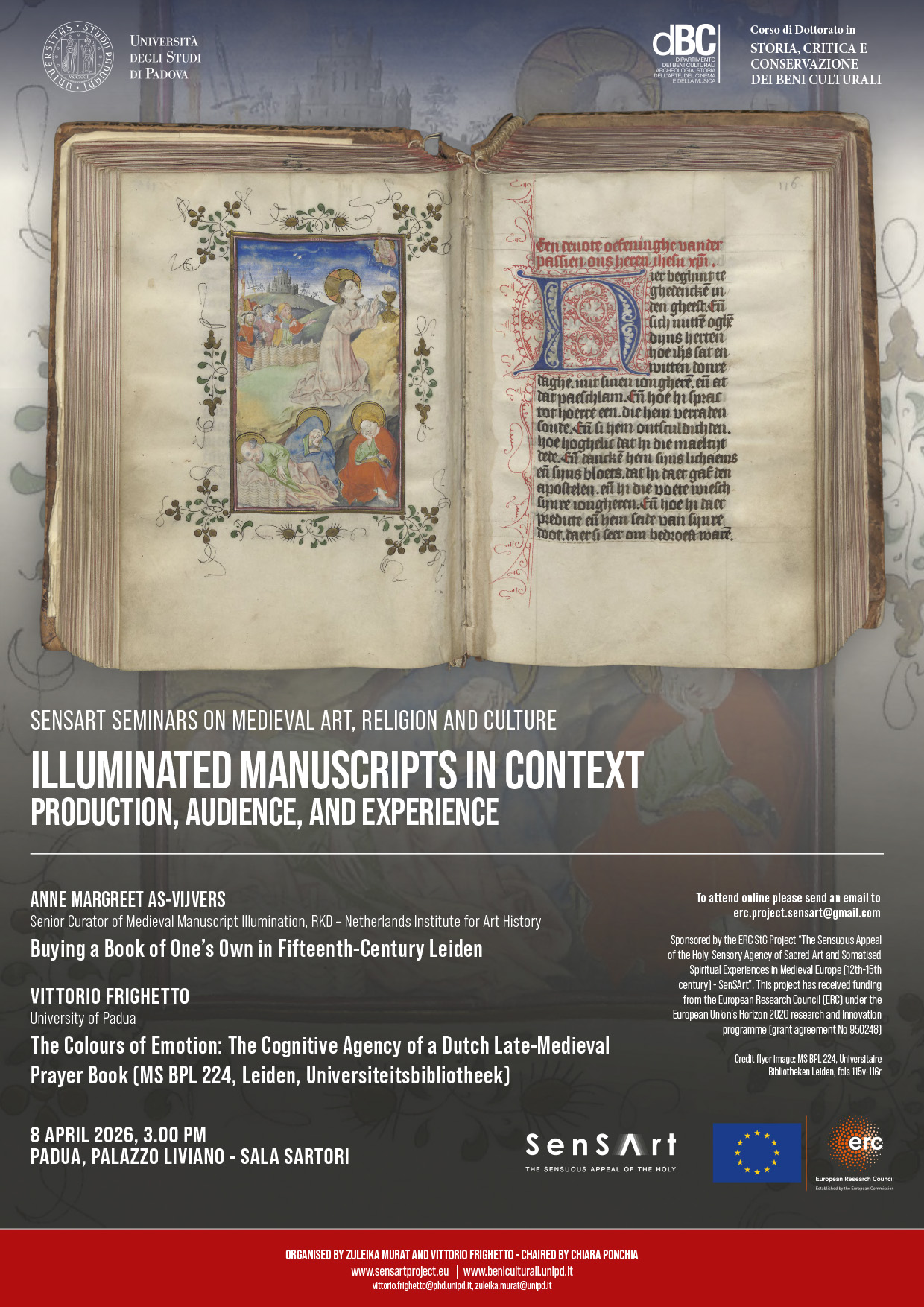 Il seminario è organizzato nell'ambito del progetto SenSArt - The Sensuous Appeal of the Holy. Sensory Agency of Sacred Art and Somatised Spiritual Experiences in Medieval Europe (12th-15th century) - No. 950248 e del Corso di Dottorato in Storia, critica e conservazione dei beni culturali dell'Università di Padova.
