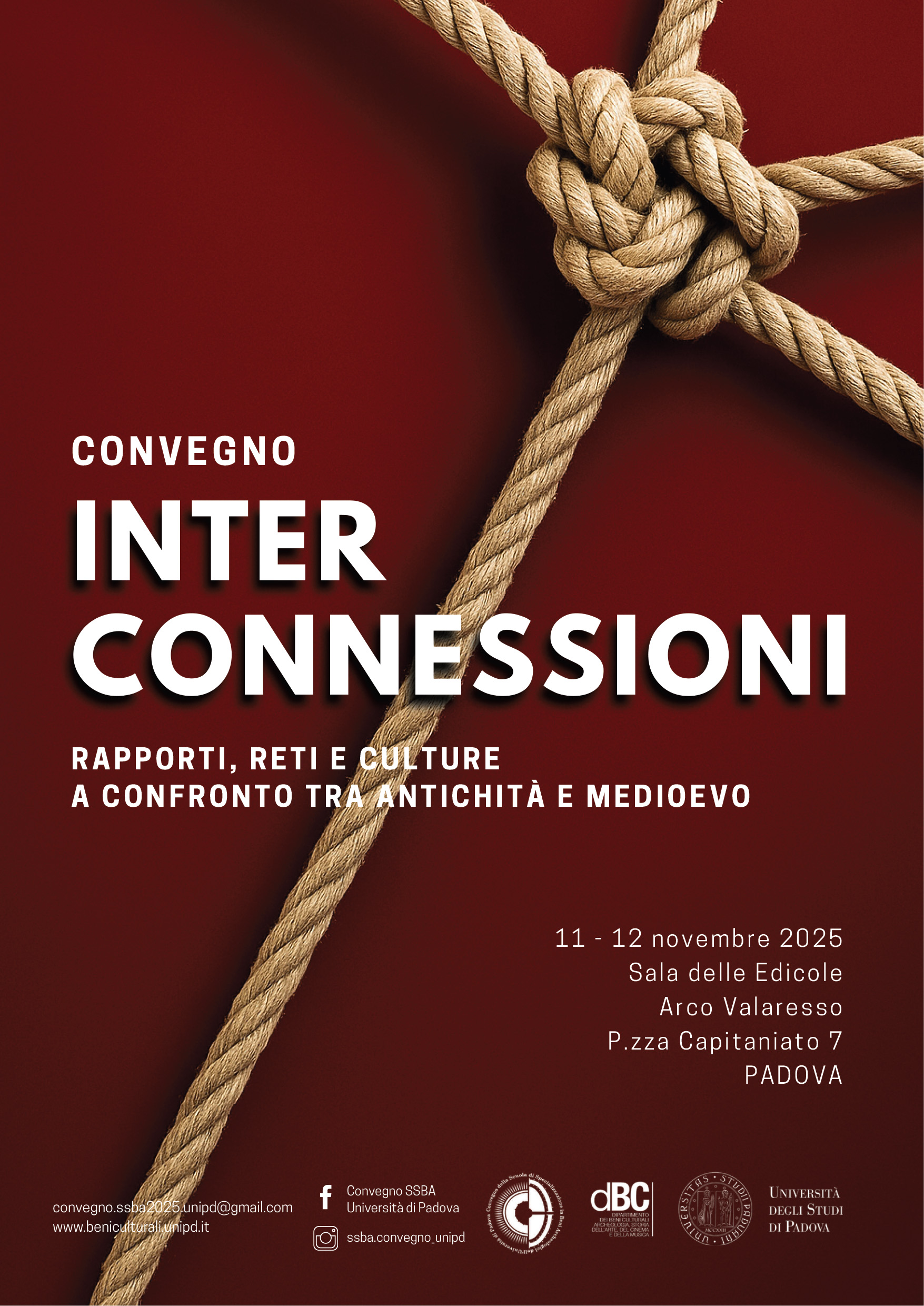 La Scuola di Specializzazione in Beni Archeologici dell'Università degli Studi di Padova promuove il convegno “Interconnessioni. Rapporti, reti e culture a confronto tra Antichità e Medioevo”. Le giornate di studio, alla terza edizione, si terranno a Padova l'11 e 12 Novembre 2025 presso la Sala delle Edicole, Arco Valaresso, P.zza Capitaniato 7, Padova.