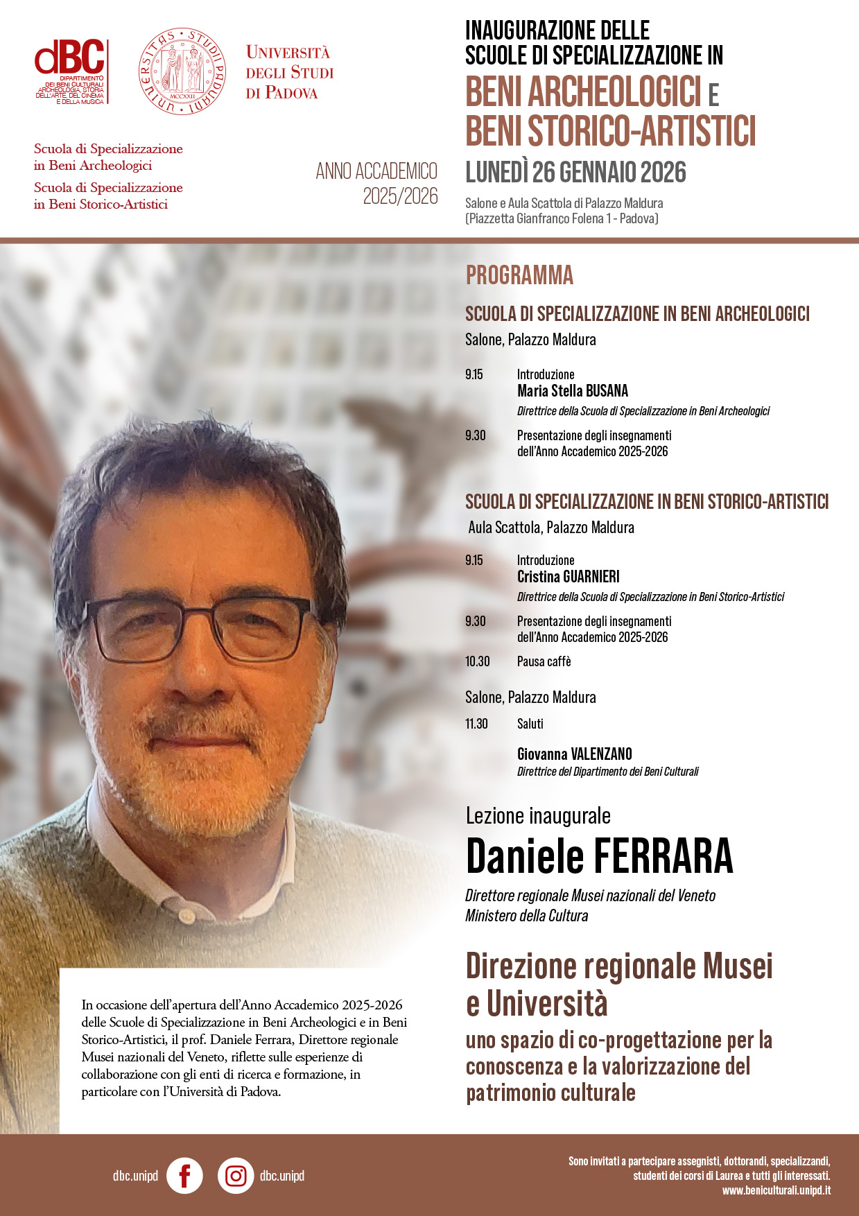 In occasione dell’apertura dell’Anno Accademico 2025-2026 delle Scuole di Specializzazione in Beni Archeologici e in Beni Storico-Artistici (Lunedì 26 gennaio 2026), il prof. Daniele Ferrara, Direttore regionale Musei nazionali del Veneto, riflette sulle esperienze di collaborazione con gli enti di ricerca e formazione, in particolare con l’Università di Padova.