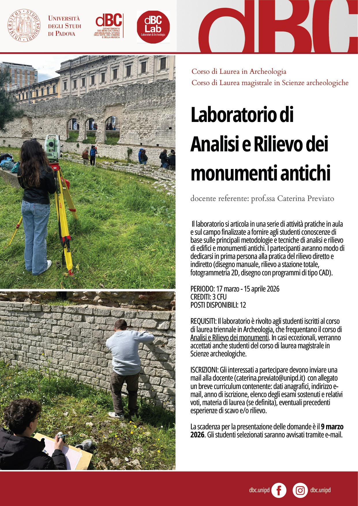 ISCRIZIONI: Gli interessati a partecipare devono inviare una mail alla docente (caterina.previato@unipd.it) con allegato un breve curriculum contenente: dati anagrafici, indirizzo e- mail, anno di iscrizione, elenco degli esami sostenuti e relativi voti, materia di laurea (se definita), eventuali precedenti esperienze di scavo e/o rilievo.