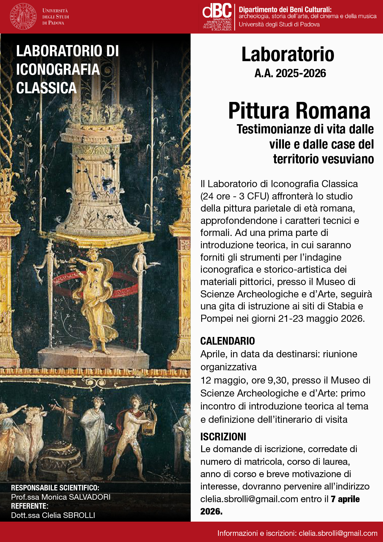 Il Laboratorio di Iconografia Classica (24 ore - 3 CFU) affronterà lo studio della pittura parietale di età romana, approfondendone i caratteri tecnici e formali. Ad una prima parte di introduzione teorica, in cui saranno forniti gli strumenti per l’indagine iconografica e storico-artistica dei materiali pittorici, presso il Museo di Scienze Archeologiche e d’Arte, seguirà una gita di istruzione ai siti di Stabia e Pompei nei giorni 21-23 maggio 2026.