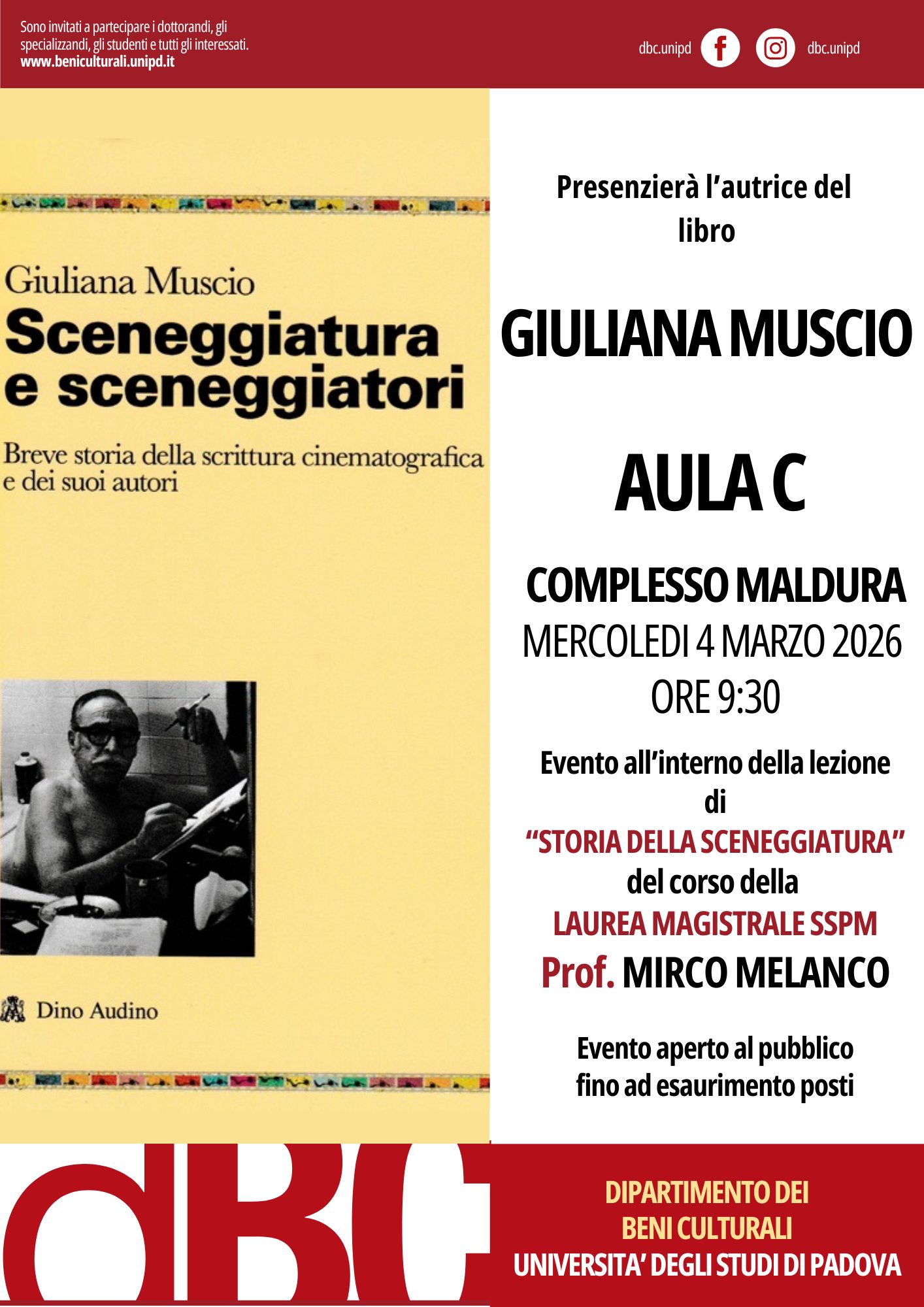 Il giorno mercoledì 4 marzo 2026 alle ore 9:30 in Aula C del Complesso Maldura, all’interno della lezione di “STORIA DELLA SCENEGGIATURA” del corso della LAUREA MAGISTRALE SSPM (Prof. Mirco Melanco), GIULIANA MUSCIO presenterà il suo volume "Sceneggiatura e sceneggiatori. Breve storia della scrittura cinematografica e dei suoi autori" (Dino Audino editore, 2024).