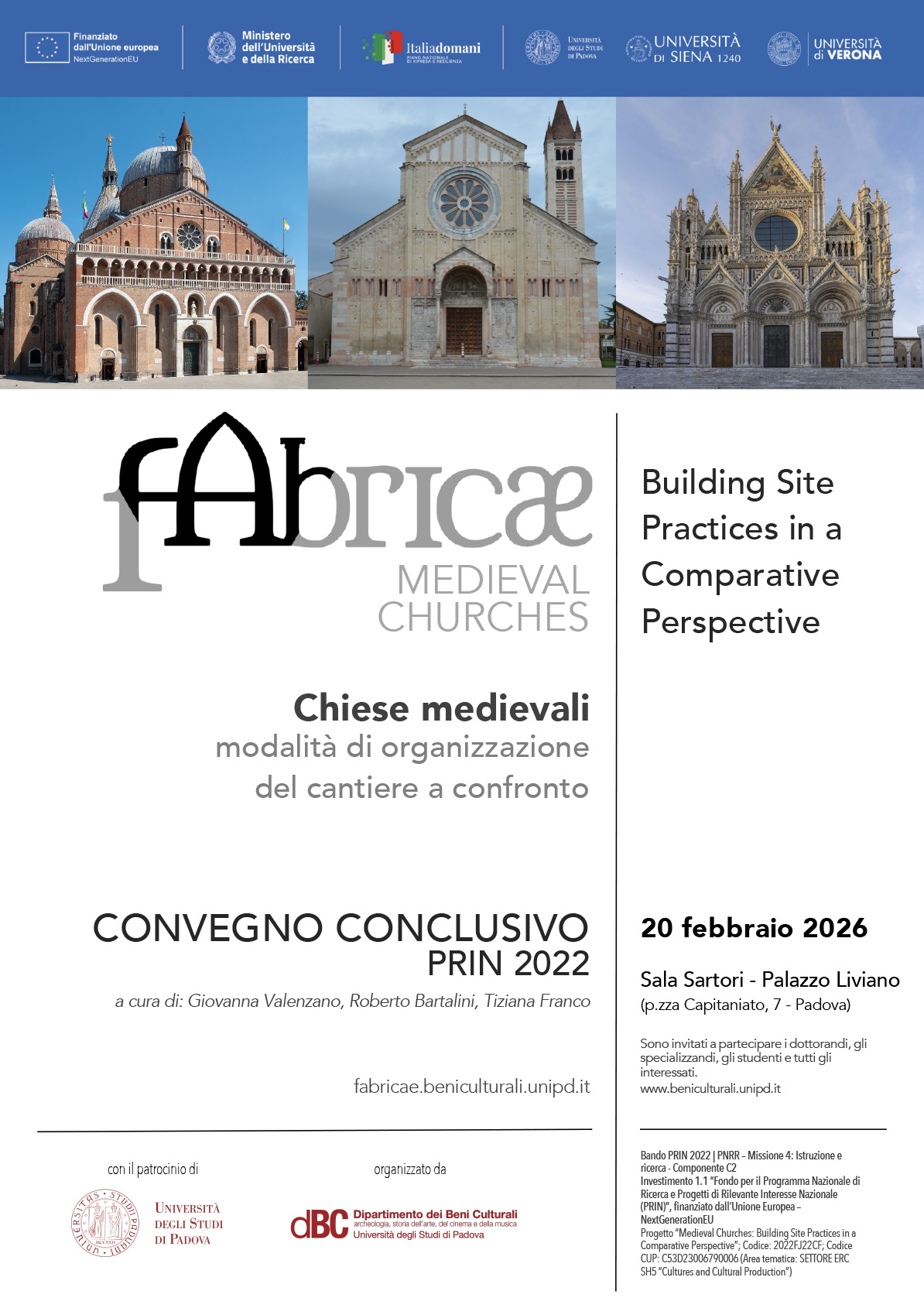 Il giorno venerdì 20 febbraio 2026, presso la Sala Sartori di Palazzo Liviano (p.zza Capitaniato, 7 - Padova) si terrà il Convegno Conclusivo PRIN 2022 del progetto "FABRICAE. Chiese medievali: modalità di organizzazione del cantiere a confronto - Medieval Churches: Building Site Practices in a Comparative Perspective" a cura di Giovanna Valenzano, Roberto Bartalini e Tiziana Franco.
