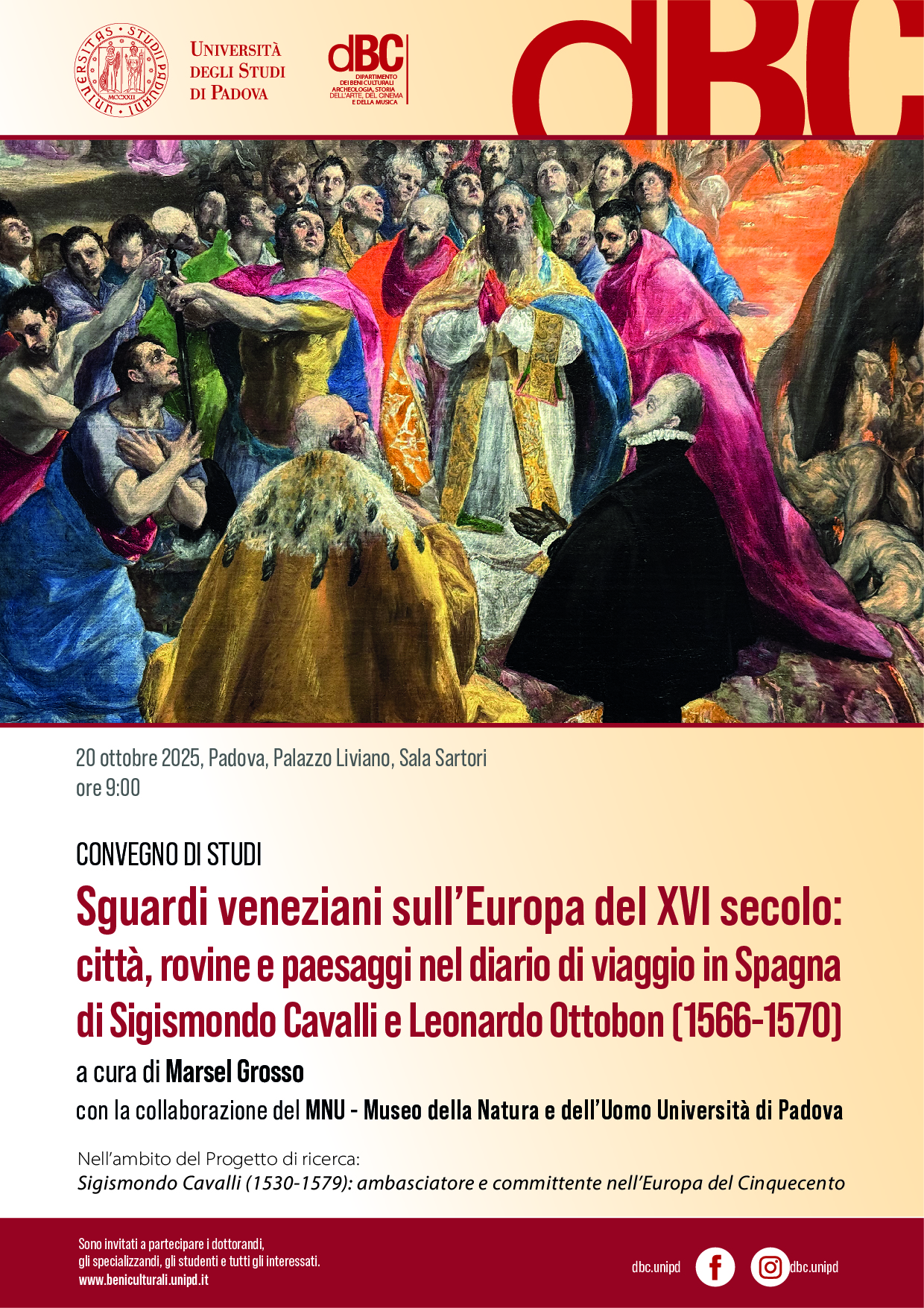 Il giorno lunedì 20 ottobre 2025, presso la Sala Sartori di Palazzo Liviano (Piazza Capitaniato 7, Padova) si terrà il Convegno di studi, nell’ambito del Progetto di ricerca "Sigismondo Cavalli (1530-1579): ambasciatore e committente nell’Europa del Cinquecento" sul tema "Sguardi veneziani sull’Europa del XVI secolo: città, rovine e paesaggi nel diario di viaggio in Spagna di Sigismondo Cavalli e Leonardo Ottobon (1566-1570)" a cura di Larsel Grosso.