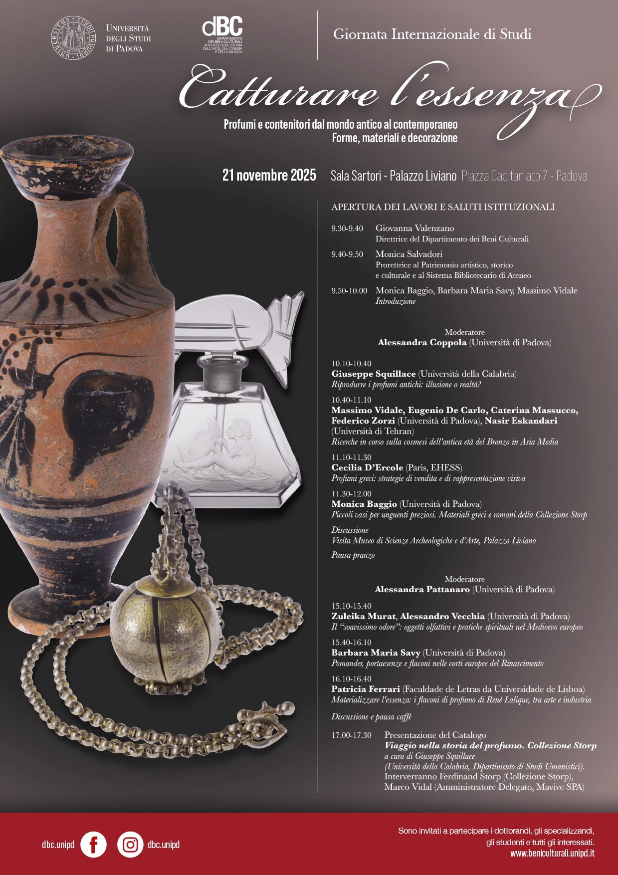 Il giorno venerdì 21 novembre 2025, alle ore 9:30 presso la Sala Sartori di Palazzo Liviano (PADOVA), si terrà la Giornata Internazionale di Studi sul tema "Catturare l’essenza: Profumi e contenitori dal mondo antico al contemporaneo" con il seguente programma: