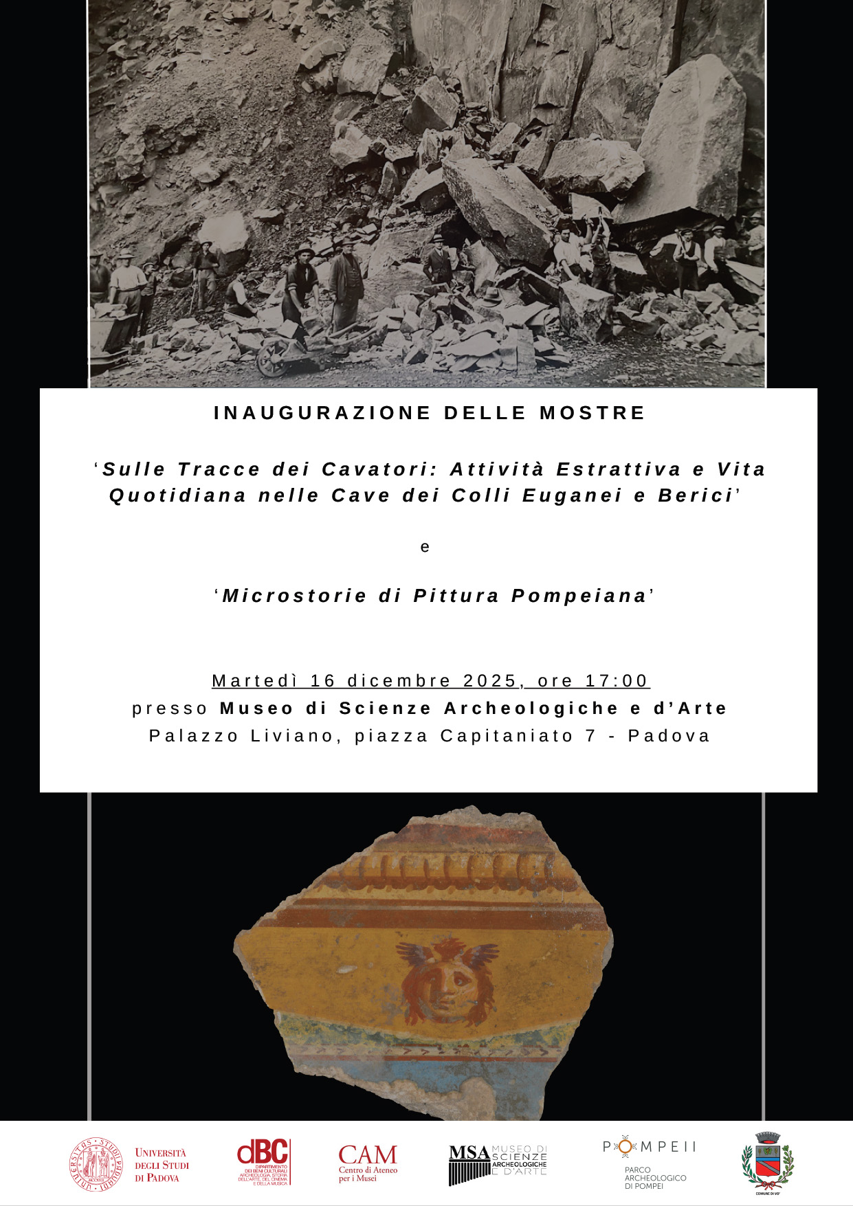 Il giorno martedì 16 dicembre 2025, alle ore 17:00, presso il Museo di Scienze Archeologiche e d’Arte (Palazzo Liviano, Piazza Capitaniato 7 - Padova) si terrà l'inaugurazione delle Mostre "Sulle tracce dei cavatori: attività estrattiva e vita quotidiana nelle cave dei Colli Euganei e Berici" e "Microstorie di Pittura Pompeiana"