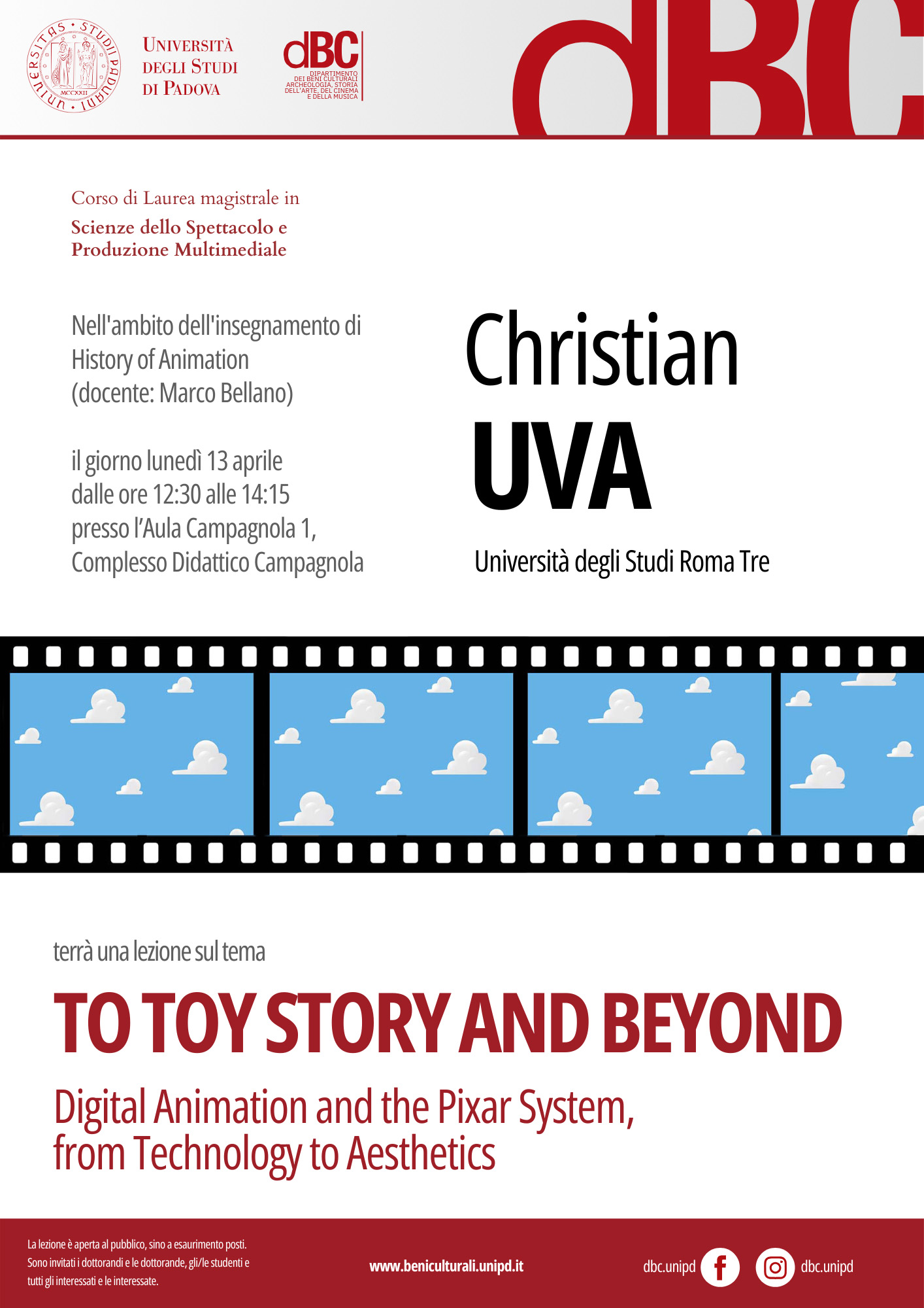 Nell’ambito dell’insegnamento di History of Animation (docente: Marco Bellano) del Corso di Laurea magistrale in Scienze dello Spettacolo e Produzione Multimediale, il giorno lunedì 13 aprile 2026, dalle ore 12:30 alle 14:15, presso l’Aula Campagnola 1 del Complesso Didattico Campagnola, Christian Uva (Università degli Studi Roma Tre) terrà una lezione dal titolo “To Toy Story and Beyond. Digital Animation and the Pixar System, from Technology to Aesthetics”. L’incontro presenterà due sue recenti pubblicazioni, Pixar: Toy Story , scritto con Martina Vita, e La “golden age” dell’animazione italiana. Dal boom economico agli anni di piombo (1957-1977) co-curato con Stefania Parigi e Giacomo Ravesi, per poi sviluppare un percorso storico e critico sul rapporto tra tecnologia ed estetica nell’animazione digitale.