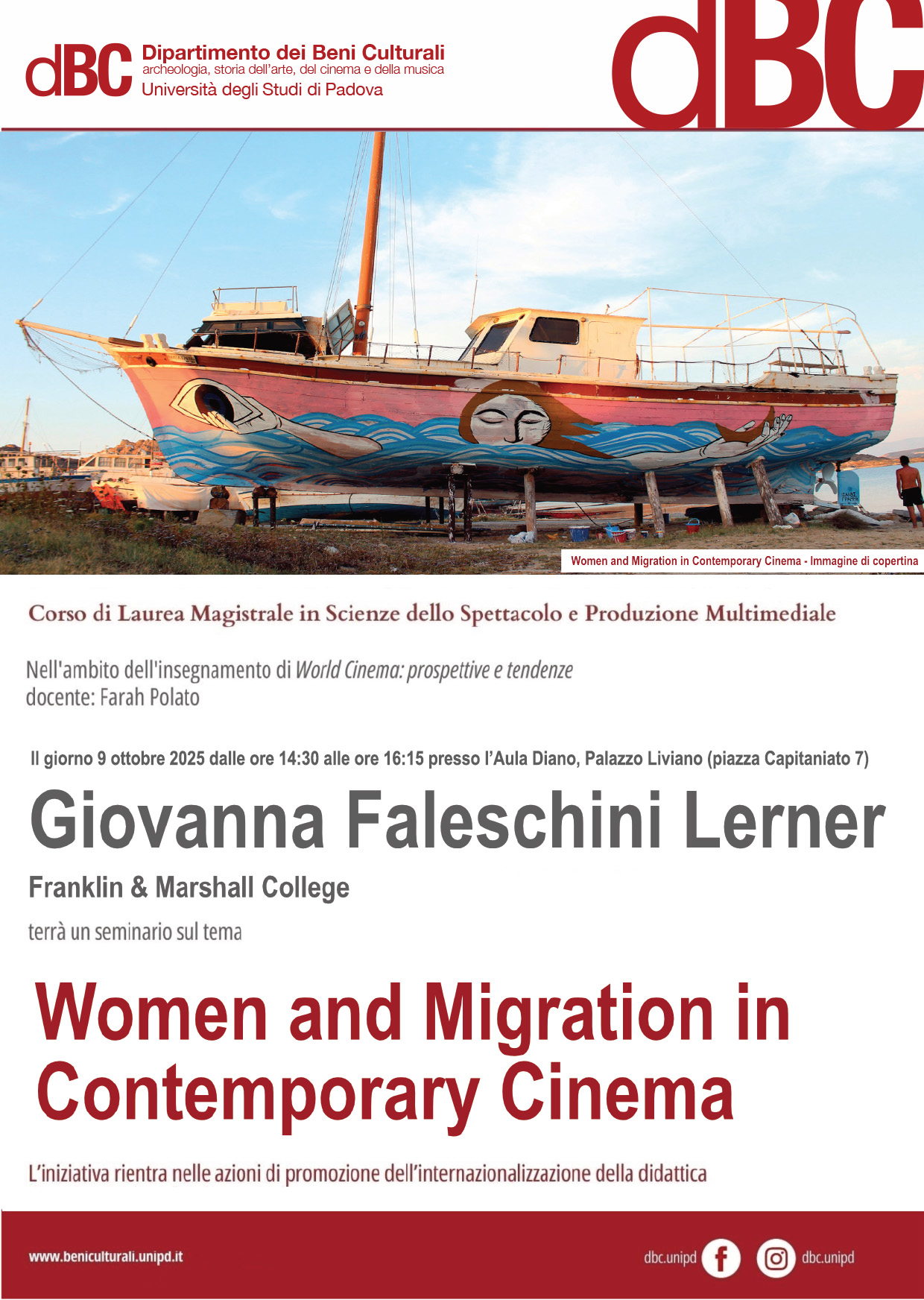 Il giorno giovedì 9 ottobre 2025, alle ore 14:30-16:15 presso l'Aula Diano di Palazzo Liviano (piazza Capitaniato 7) Giovanna FALESCHINI LERNER (Franklin & Marshall College- Lancaster, Pennsylvania) terrà il seminario dal titolo "Women and Migration in Contemporary Cinema".